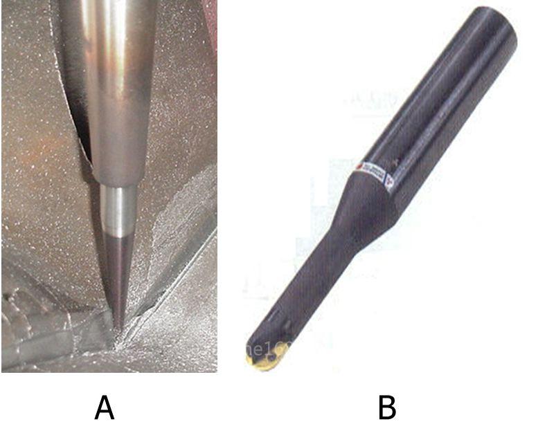 在加工時(shí),可以的話,盡可能選擇大直徑刀具或采用加壯刀具來加工,以減低彈刀風(fēng)險(xiǎn)(如下右圖所示:A采用熱索和錐頸刀,B采用加壯刀柄的刀具來加工)。