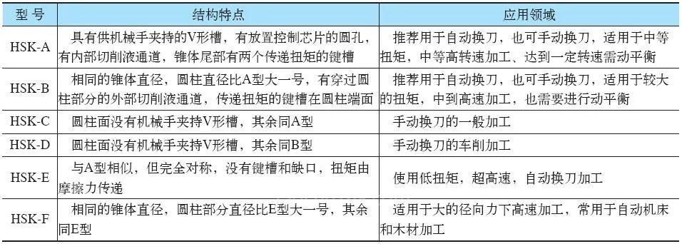 表8-13 HSK工具系統(tǒng)的6種型號(hào)的特點(diǎn)和應(yīng)用領(lǐng)域