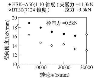 國(guó)內(nèi)采用DIN6989b-1中的A型和C型標(biāo)準(zhǔn),如HSK50A、HSK63A、HSK100A等。HSK50和HSK63刀柄的主軸轉(zhuǎn)速可達(dá)25000r/min,HSK100刀柄可12000r/min,精密平衡后的HSK刀柄可達(dá)40000r/min。隨著轉(zhuǎn)速增加,徑向剛度將有所降低。圖8-64為HSK與BT錐柄主軸轉(zhuǎn)速與徑向剛度關(guān)系的比較。