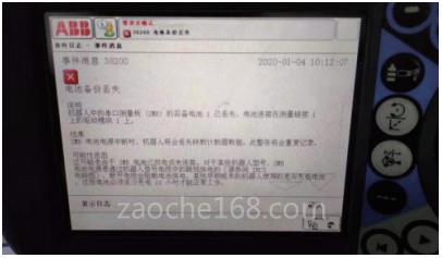 一臺ABB機(jī)器人應(yīng)用于火焰噴涂表面處理領(lǐng)域,如圖1所示。設(shè)備開機(jī)后機(jī)器人示教器上顯示“SMB串口測量板后備電池已丟失,機(jī)器人轉(zhuǎn)數(shù)計數(shù)器數(shù)據(jù)丟失”,機(jī)器人無法執(zhí)行動作,報警信息如圖2所示。