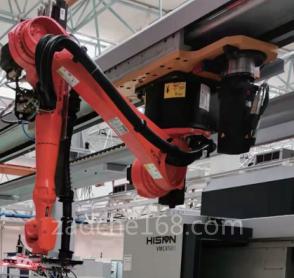 一臺倒掛式KUKA機(jī)器人用于在自動化產(chǎn)線上進(jìn)行零件上下料工作,如圖3所示。在初期調(diào)試過程中因A1軸軟限位參數(shù)設(shè)置不當(dāng)而導(dǎo)致機(jī)器人在運動過程中發(fā)生了碰撞,A4軸電動機(jī)損壞,傳動桿彎曲,如圖4所示。