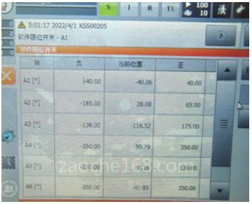 2)點擊示教器主菜單→投入運行→售后服務(wù)→軟件限位開關(guān)→修改軟限位,如圖7所示。也可以進(jìn)入文件R1-Mada-Machine,在文本中進(jìn)行修改。3)根據(jù)現(xiàn)場應(yīng)用情況,將原來的A 1軸軟限位參數(shù)±185°修改至±40°(見圖8),避免再次出現(xiàn)碰撞情況。