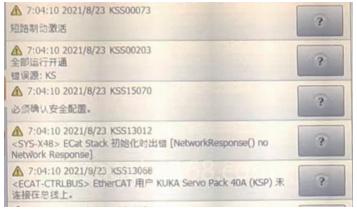 一臺KUKA機(jī)器人因長期未使用,開機(jī)后示教器出現(xiàn)初始化錯誤及安全模塊故障報警,如圖9所示。