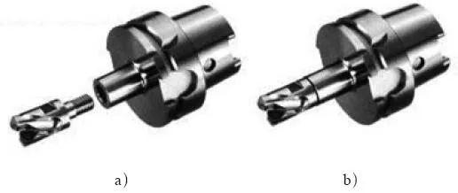 2)用螺紋連接模塊化刀具的HSK刀柄。為實(shí)現(xiàn)工序集中,提高加工效率,在模具加工中一些刀具廠(chǎng)商開(kāi)發(fā)了用螺紋連接模塊化刀具的HSK刀柄。下面以三菱公司的產(chǎn)品為例來(lái)作說(shuō)明。三菱公司目前使用的為HSK63A刀柄,其刀頭裝拆如圖2所示,其螺紋部分尺寸是M8~M16,所裝立銑刀刀頭均是多功能帶可轉(zhuǎn)位刀片的,刀頭尺寸一般為φ16~φ40mm。裝上可轉(zhuǎn)位刀片的立銑刀頭的精度雖不及精密的整體立銑刀,但不需重磨,轉(zhuǎn)位后可繼續(xù)加工。隨工件材料不同可更換不同材質(zhì)的刀片,不同的切削條件尚可選擇不同的斷屑槽刀片,一種刀頭能加工多種型面,當(dāng)某種型面采用一種刀頭不能加工時(shí),可迅速換上另一種刀頭,故能在粗加工和半精加工中提高加工效率。