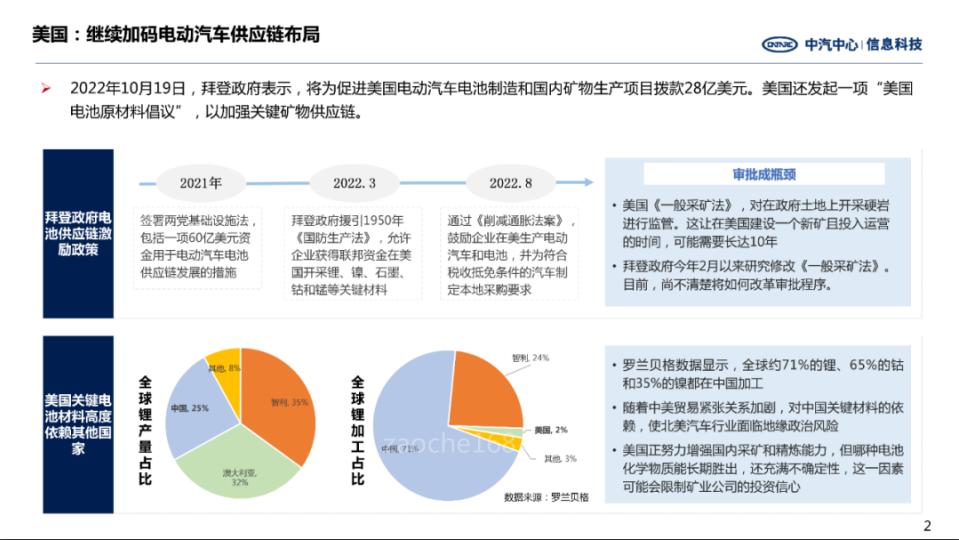 2022年10月19日,拜登政府表示,將為促進美國電動汽車電池制造和國內礦物生產(chǎn)項目撥款28億美元。美國還發(fā)起一項“美國電池原材料倡議”,以加強關鍵礦物供應鏈。