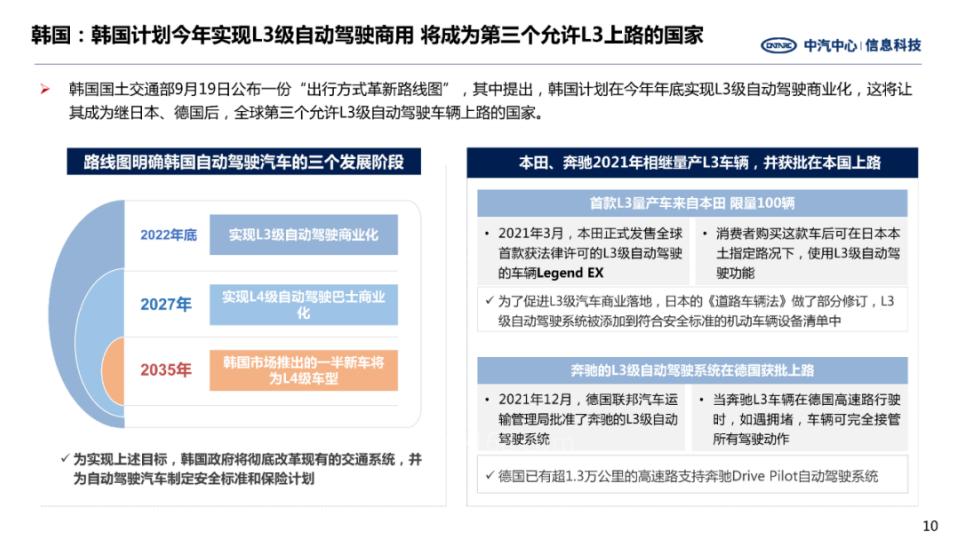 韓國國土交通部9月19日公布一份“出行方式革新路線圖”,其中提出,韓國計劃在今年年底實現(xiàn)L3級自動駕駛商業(yè)化,這將讓其成為繼日本、德國后,全球第三個允許L3級自動駕駛車輛上路的國家。
