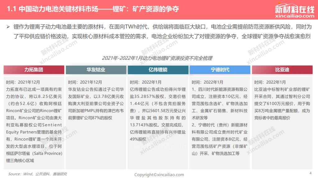 鋰作為鋰離子動力電池最主要的原材料,在面向TWh時代,供給端將面臨巨大缺口,電池企業(yè)需提前防范資源斷供風險,同時為了平抑供應鏈價格波動,實現(xiàn)核心原材料成本管控的需求,電池企業(yè)紛紛加大了對鋰資源的爭奪,全球鋰礦資源爭奪戰(zhàn)愈演愈烈。