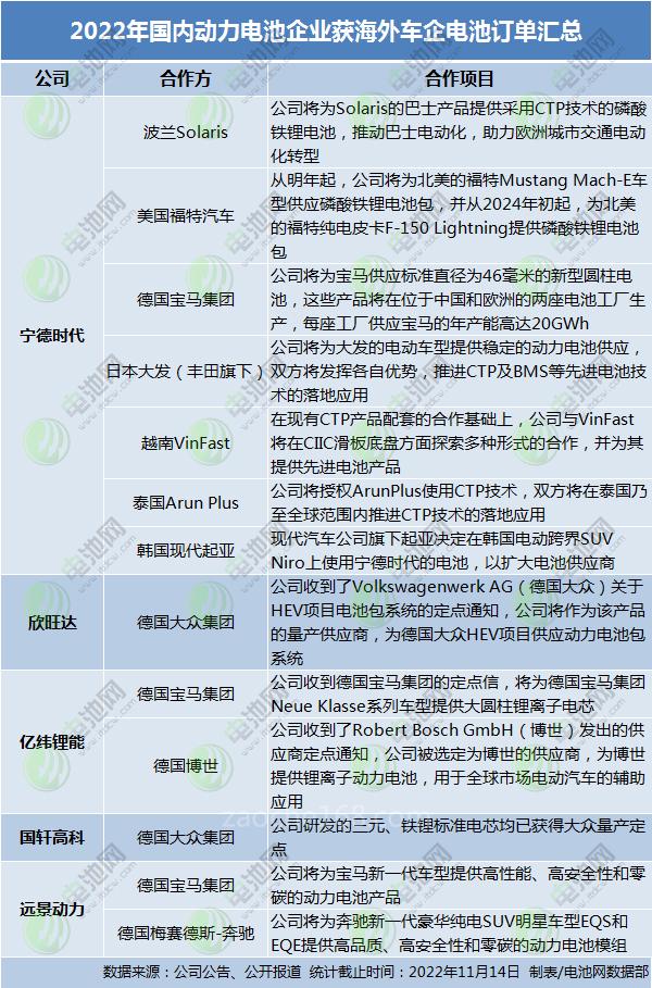 據(jù)不完全統(tǒng)計(jì),進(jìn)入2022以來,有5家國(guó)內(nèi)電池電池企業(yè)宣布獲得海外車企動(dòng)力電池訂單,合作簽訂周期以3-5年為主。其中寧德時(shí)代共達(dá)成7筆合作,包括日本、韓國(guó)、歐洲、美國(guó)、越南、泰國(guó)等地,走在國(guó)際供應(yīng)的前端。