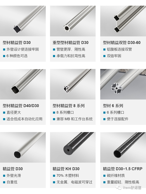 還有專為特殊應(yīng)用開發(fā)的具有特殊功能的各種型材,包括抗彎強(qiáng)度更高的重型型材、由 70%木質(zhì)復(fù)合材料制成的精益管(允許電磁波通過)以及重量超輕的碳管。除了氧化銀白的金屬型材,也提供彩色型材,可以用于標(biāo)記某些特殊位置。