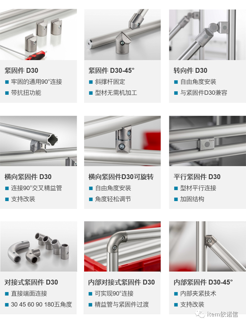 緊固件 D30 采用重型壓鑄鋁材料,能夠確保連接牢固持久,不需要經(jīng)常重新擰緊。型材精益管上極高的夾緊力可以確保結(jié)構(gòu)牢固穩(wěn)定。D30 型材精益管系統(tǒng)具有出色的穩(wěn)定性和安全性,這在工業(yè)環(huán)境的日常使用中是至關(guān)重要的。