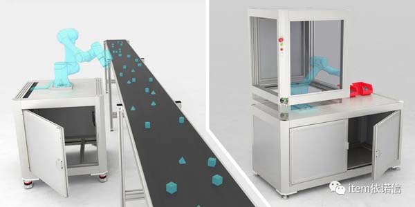 半封閉式協(xié)作型機(jī)器人機(jī)柜上的機(jī)器臂可以使用整個(gè)工作臺(tái)面,而工人則受到可拆卸式蓋板的保護(hù),這樣機(jī)器人就可以在協(xié)作區(qū)域外以更高的速度運(yùn)行。借助抗沖擊性大玻璃,員工可以隨時(shí)監(jiān)控機(jī)器人的工作過(guò)程。所有的電纜都穿過(guò) XMS 系列型材搭建的電纜線槽,從而起到保護(hù)作用。特殊的緊固件組件可以在垂直型材和水平型材之間形成進(jìn)線口,從而方便用戶輕松分離不同的區(qū)域。