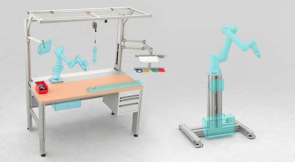 配有整合式臺(tái)下柜的島式機(jī)器人非常適合需要在不同工作站之間頻繁切換的應(yīng)用。借助頂部的槽軌臺(tái)面,協(xié)作型機(jī)器人可以根據(jù)需要定位和調(diào)整。用戶可使用 XMS 系列型材進(jìn)行電纜管理——將所有電纜穿過(guò)電纜線槽,并且可從外部接入電纜和導(dǎo)線,還能輕松集成各種控制元件??刂破鲃t安裝在封閉的安全區(qū)域。