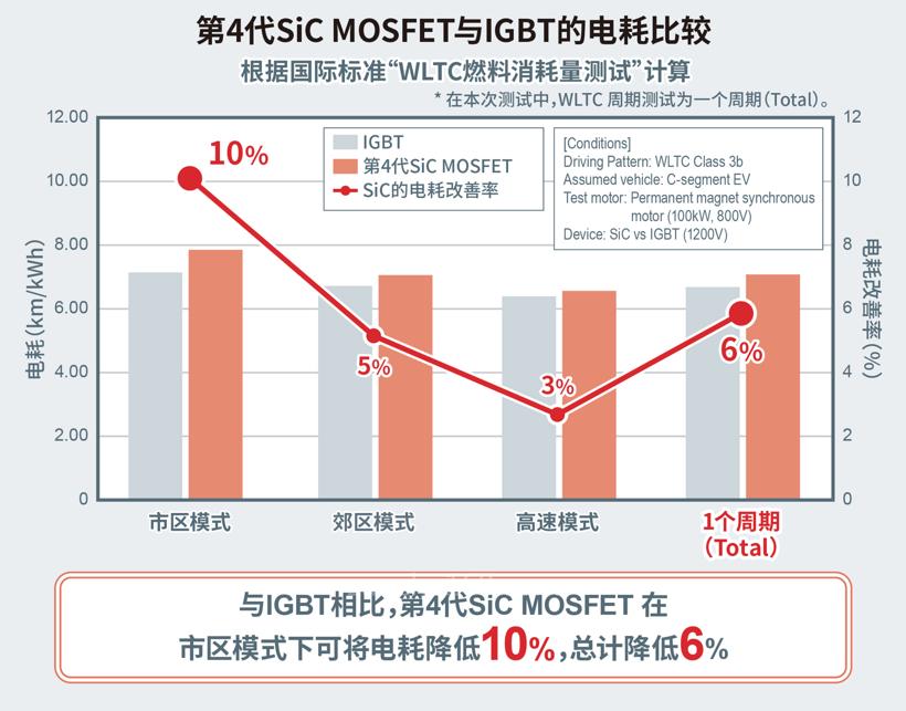 2020年完成開發(fā)的新一代碳化硅MOSFET(第4代),改善了短路耐受時間,并實現(xiàn)了業(yè)界超低的導(dǎo)通電阻。在車載逆變器中采用該產(chǎn)品時,與使用IGBT時相比,電耗可以減少6%(按國際標(biāo)準(zhǔn)“WLTC燃料消耗量測試”計算),非常有助于延長電動汽車的續(xù)航里程。目前,除了裸芯片之外,還正在開發(fā)分立封裝產(chǎn)品,在此次的共創(chuàng)項目中,羅姆計劃開發(fā)并提供內(nèi)置這種最新碳化硅MOSFET(第4代)的功率模塊。
