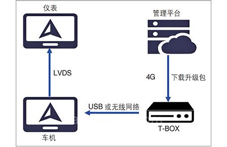 如圖2所示,平臺下發(fā)任務(wù)后T-BOX通過4G無線網(wǎng)絡(luò)通道下載升級包,并進(jìn)行校驗分發(fā),車機通過USB或無線網(wǎng)絡(luò)接收軟件后判斷是車機軟件包還是儀表軟件包,若為儀表軟件包則通過儀表與車機之間原有的LVDS線(LVDS正常應(yīng)用于車機給儀表傳輸導(dǎo)航地圖信息)傳輸軟件包。