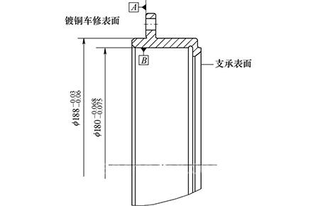 修理車(chē)間對(duì)軸承座配合尺寸φ188(-0.03/-0.06mm)進(jìn)行檢查,若該尺寸因磨損而不滿(mǎn)足裝配要求,則對(duì)該表面進(jìn)行鍍銅處理,再經(jīng)機(jī)加工車(chē)間對(duì)該表面進(jìn)行車(chē)削加工:①對(duì)該表面進(jìn)行初始切削加工,將需鍍銅表面車(chē)削加工到露出機(jī)體材料,呈現(xiàn)金屬色為止。②將零件發(fā)送至表面處理車(chē)間,進(jìn)行配合表面鍍銅的工序。③鍍銅后返回加工車(chē)間對(duì)鍍銅表面進(jìn)行粗、精加工,最終保證配合尺寸要求。