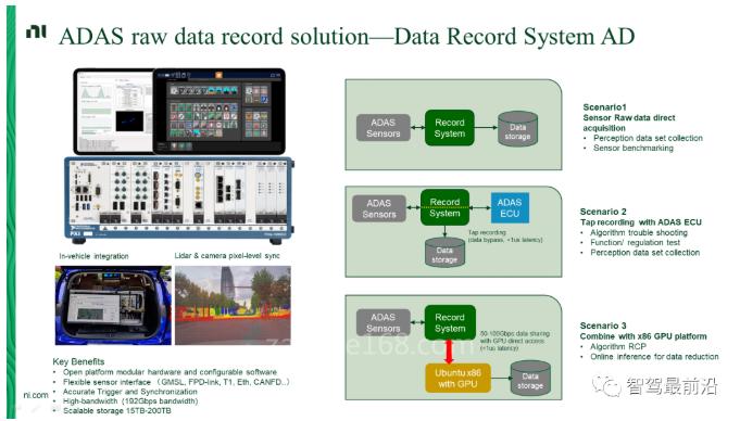 NI提供的基于PXI平臺(tái)的模塊化數(shù)據(jù)采集方案,可以滿足多路攝像頭、車載以太網(wǎng)、CAN/CANFD、GPS等的數(shù)據(jù)采集,還能滿足不斷階段的數(shù)據(jù)采集需求。比如,ADAS域控制器已經(jīng)基本在研發(fā)和迭代的階段,可以通過數(shù)據(jù)旁通采集的方法,將NI測試設(shè)備作為一個(gè)中間件,從中間把數(shù)據(jù)采集回來,這樣就不會(huì)破壞掉傳感器到ECU的數(shù)據(jù)鏈路。此外,NI的解決方案支持15TB~200TB的數(shù)據(jù)存儲(chǔ)容量。