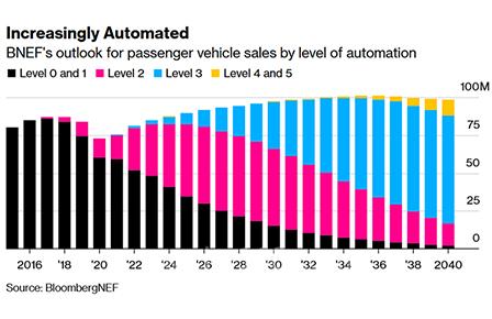 BNEF還預(yù)計,到2033年,L3級自動駕駛汽車將蠶食L2級自動駕駛汽車的銷量,成為全球最常見的乘用車自動駕駛類別,銷量將達(dá)到近5,000萬輛。即使到2040年,L4級和L5級robotaxi也只占自動駕駛系統(tǒng)市場的一小部分。
