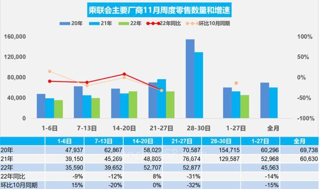 當(dāng)然,由于近期國內(nèi)疫情反彈,乘聯(lián)會也表示,車企經(jīng)銷商閉店比例有所上升,對市場展廳流量和訂單情況產(chǎn)生較大影響。數(shù)據(jù)顯示,11月第四周(11月21日-27日)總體狹義乘用車市場零售達(dá)到日均5.3萬輛,同比下降31%,相對今年10月第四周均值下降32%。