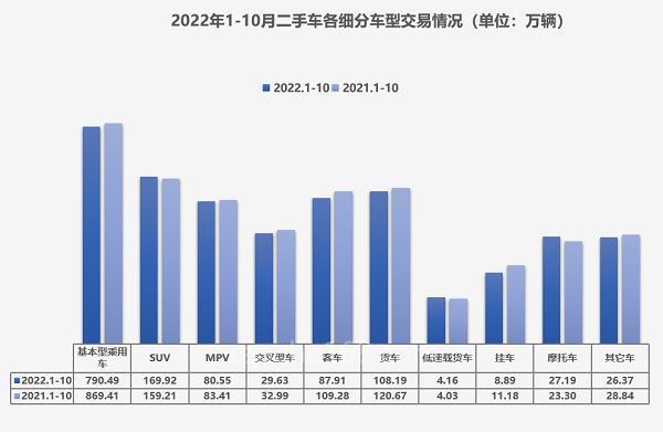 最新數(shù)據(jù)顯示,今年1-10月,全國(guó)二手車市場(chǎng)累計(jì)交易量1333.30萬輛,同比下降7.6%。基本型乘用車共交易790.49萬輛,同比下降9.1%;SUV共交易169.92萬輛,同比增長(zhǎng)6.7%;MPV共交易80.55萬輛,同比下降3.4%;交叉型乘用車共交易29.63萬輛,同比下降10.2%。流通協(xié)會(huì)預(yù)計(jì),11月全國(guó)二手車交易量約為127萬輛,同比將下降17.5%。