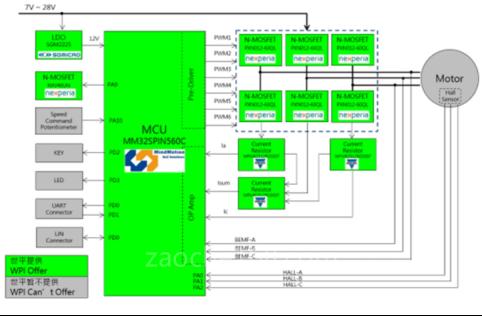 圖示3-大聯(lián)大世平基于MindMotion產(chǎn)品的低壓無刷電機(jī)驅(qū)動(dòng)方案的方塊圖