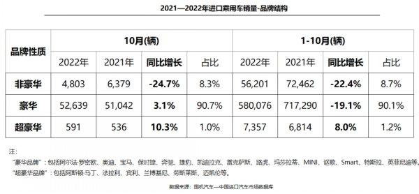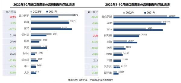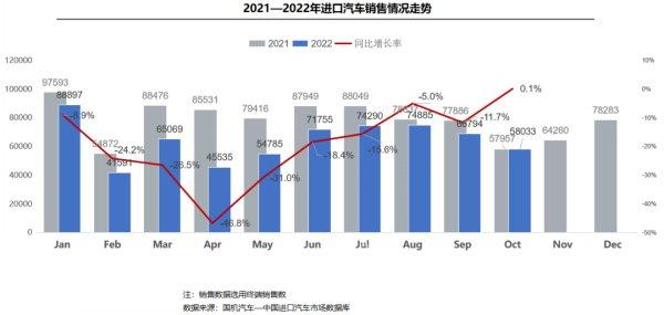中國汽車流通協(xié)會分析,10月數(shù)據(jù)同比上升,主要原因為去年同期芯片短缺形成的低基數(shù)。今年10月進口車市場受疫情反復及消費需求減弱等因素影響,呈現(xiàn)旺季不旺特征。