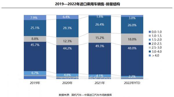 排量方面,1-10月進口乘用車排量在1.5-2.0L中的車型占比為47.9%,相比2021年有所下滑,但仍保持第一大排量區(qū)間;2.5-3.0L為第二大排量區(qū)間,在保時捷Panamera銷量增長帶動下,份額較2021年有所提升;一同提升的還有3.0L以上排量區(qū)間,受平行進口車型逐步恢復供應影響,份額反彈至5.4%。
