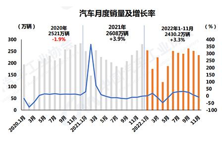 1-11月,汽車(chē)產(chǎn)銷(xiāo)分別達(dá)到2462.8萬(wàn)輛和2430.2萬(wàn)輛,同比分別增長(zhǎng)6.1%和3.3%,累計(jì)增速放緩,較1-10月分別收窄1.8和1.3個(gè)百分點(diǎn)。