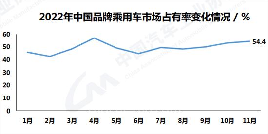 中國品牌乘用車方面,11月共銷售汽車112.9萬輛,同比增長9.8%,占乘用車銷售總量的54.4%,上升7.6個百分點;前11個月累計銷售1047.9萬輛,同比增長24.2%,市場份額為49.2%,上升5個百分點。