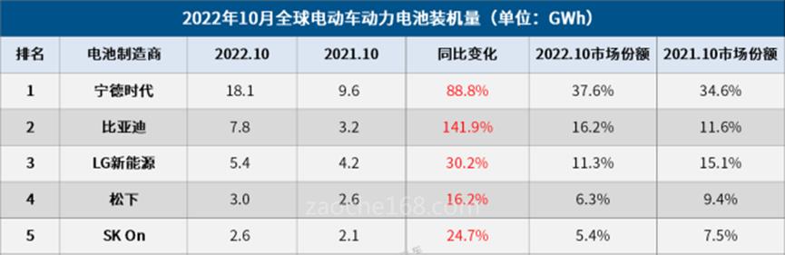 近日,韓國(guó)市場(chǎng)研究機(jī)構(gòu)SNE Research公布數(shù)據(jù):2022年10月,全球電動(dòng)汽車電池裝機(jī)量達(dá)到48 GWh,同比增長(zhǎng)73.6%。其中,寧德時(shí)代裝機(jī)量高達(dá)18.1 GWh,同比大漲88.8%,市場(chǎng)份額達(dá)到37.6%,遙遙領(lǐng)先。
