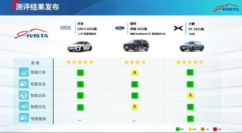 IVISTA中國智能汽車指數2020版測評體系根據智能汽車的功能特點,由智能行車、智能泊車、智能安全、智能交互、智能能效五個分指數組成。對于傳統(tǒng)能源汽車僅測試前四項;對于新能源汽車,測試全部五項。IVISTA 2020版“智能星級”評定,根據各個分指數的評價結果綜合評定。本次發(fā)布3款車型測評結果,分別是長安 UNI-V、福特 領睿和小鵬 P5。其中,長安 UNI-V(2022款 1.5T 智慧領航型)為燃油車,因此不測試智能能效,智能行車評級為G(優(yōu)秀),智能安全為G(優(yōu)秀),智能泊車為G(優(yōu)秀),智能交互為G(優(yōu)秀),根據2020版測評規(guī)程,智能星級評定為5星。福特領睿(2022款 改款 EcoBoost170 尊領型PLUS)為燃油車,因此不測試智能能效,智能行車評級為A(良好),智能安全為G(優(yōu)秀),智能泊車為G(優(yōu)秀),智能交互為A(良好),根據2020版測評規(guī)程,智能星級評定為4星。小鵬P5(2021款 550E)智能行車評級為G(優(yōu)秀),智能安全為G(優(yōu)秀),智能泊車為A(良好),智能交互為G(優(yōu)秀),智能能效為G(優(yōu)秀),根據2020版測評規(guī)程,智能星級評定為5星。