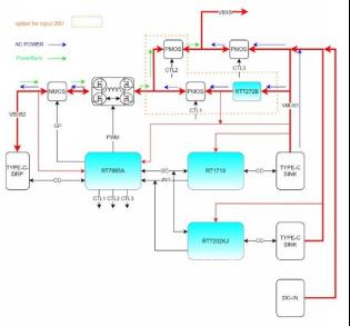 在此方案中設(shè)計(jì)了三個(gè)電源輸入端,其中一個(gè)是傳統(tǒng)的DC-IN端口,另外有兩個(gè)是Type-C端口,這兩個(gè)C端分別接入了RT7202KJ及RT1719來實(shí)現(xiàn)PD SINK的要電功能,并借助I2C跟后端RT7885A進(jìn)行通信。