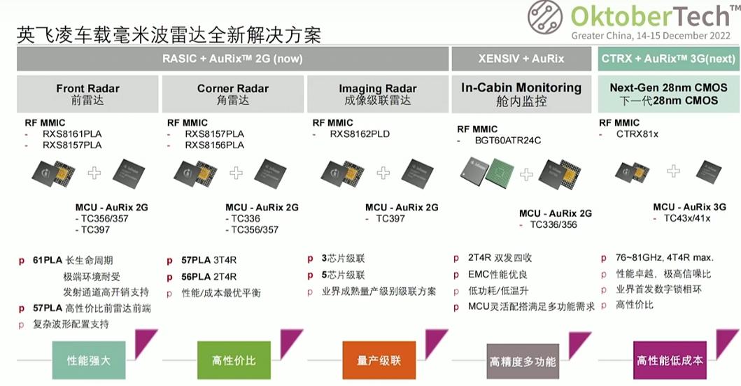 在角雷達(dá)方面,針對成本比較敏感的客戶,英飛凌有2發(fā)4收的RXS8156PLA,搭配相對經(jīng)濟(jì)的TC336和TC356系列,或者TC357系列的AURIX?MCU,可以給用戶提供具有性價(jià)比的角雷達(dá)方案。