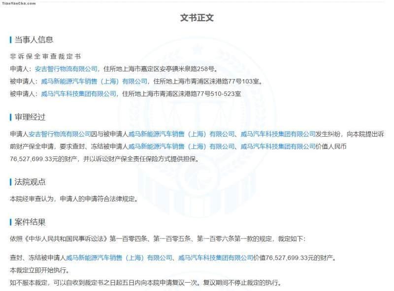 此外,今日我們從天眼查獲悉,威馬被申請凍結(jié)7652萬財產(chǎn)。安吉智行物流有限公司與威馬新能源汽車銷售(上海)有限公司、威馬汽車科技集團有限公司非訴保全審查裁定書公開。文書顯示,申請人安吉智行物流公司請求法院查封、凍結(jié)被申請人威馬兩公司價值7652萬元的財產(chǎn)。法院認(rèn)為,安吉智行物流公司的申請符合法律規(guī)定,裁定執(zhí)行。