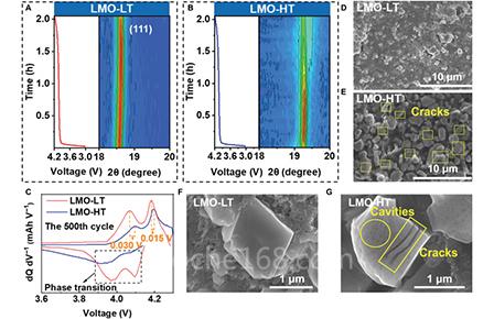 不可逆相變的連續(xù)積累導(dǎo)致LMO顆粒產(chǎn)生裂紋,而LMO顆粒裂紋產(chǎn)生的新暴露表面可以與電解質(zhì)相互作用,從而促進(jìn)MnLMO中溶解,導(dǎo)致LMO表面過度鋰化,進(jìn)而加速不可逆相變和顆粒裂紋。上述問題都會(huì)導(dǎo)致LMO顆粒的劣化和性能的快速衰減,尤其是在快速充電條件下。
