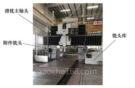 HF-5M五面體加工中心是三一汽車起重機公司的關鍵、重點設備,主要用于汽車起重機回轉臺、吊臂及車架等大型工件的加工,外形如圖1所示。該機床是由日本進口的一臺高精尖設備,是一種集機械、電氣、液壓氣動及數(shù)控系統(tǒng)于一體的大型龍門加工中心。該機床功能強大、精度高、運行可靠,但在生產過程仍然會出現(xiàn)各種各樣的故障,由于其結構復雜,維修難度大,所以一般情況下都是聯(lián)系生產廠家來處理,但這種方式費工、費時、費錢,且耽誤生產。因此我公司對機床的結構及工作原理開展深入研究,自行維修,及時排除故障,可做到省工、省時、省錢,且高效生產。本文主要對附件銑頭交換故障進行分析和研究。