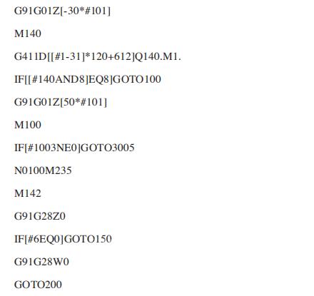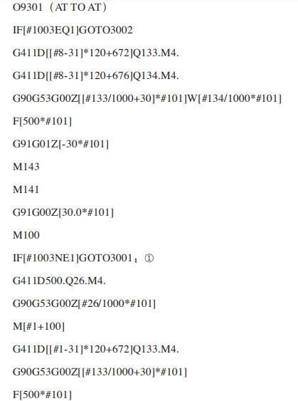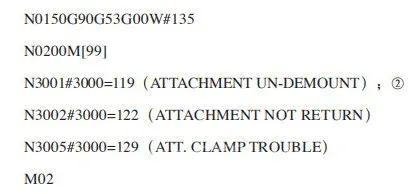 (1)在FANUC系統(tǒng)中查找相應宏程序[1] 報警號3119是一個由FANUC宏程序產生的報警,從這個報警信息開始分析。由報警可知,系統(tǒng)變量#3000中對應的值為119,根據(jù)這一線索,在FANUC系統(tǒng)中查找到對應的宏程序為O9301,這是一個附件銑頭自動交換的宏程序。具體宏程序內容如下。