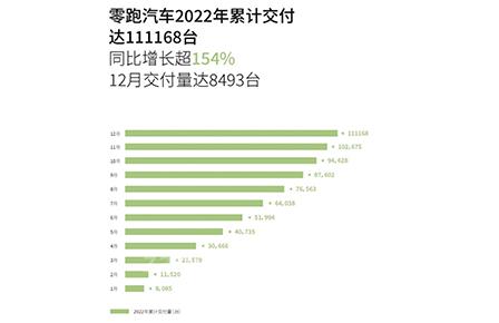 日前,零跑汽車公布了2022年12月份及全年銷量情況。其中,12月份交付新車8493輛;2022年累計交付新車達111168輛,累計交付同比增長超154%。