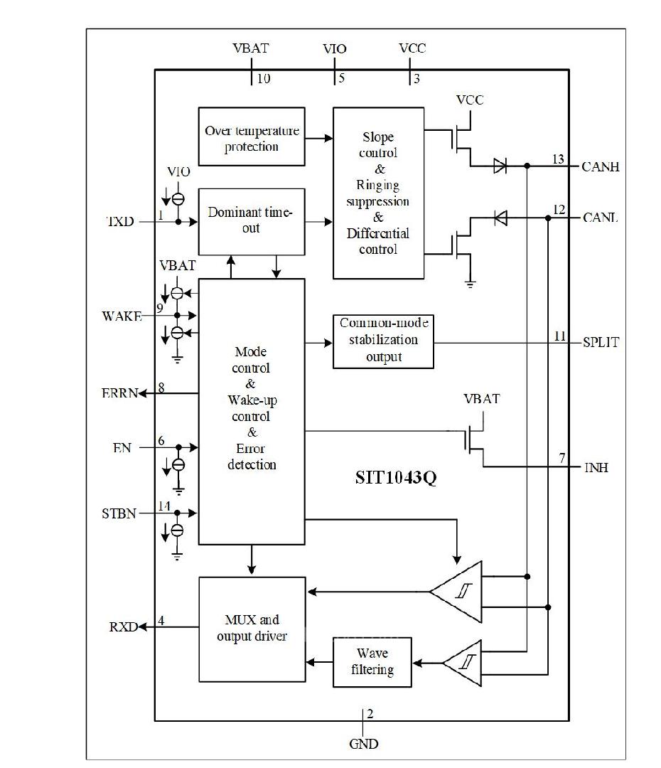 SIT1043采用多電源供電,擁有多種系統(tǒng)保護(hù)和診斷功能以提高器件和CAN的穩(wěn)定性。另外,SIT1043擁有正常工作模式、靜音模式、待機(jī)模式、睡眠等待模式和睡眠模式等五種工作模式,在低功耗模式下支持本地喚醒與遠(yuǎn)程功能,這一模式能極大節(jié)省 CAN 總線應(yīng)用系統(tǒng)的電力。