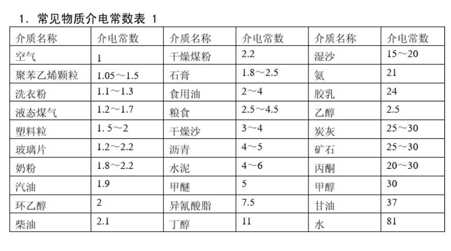 最后,影響感應距離的主要因素是目標物的介電常數(shù)。 對于電容式物位傳感器,介電常數(shù)越高,材料就越容易被檢測到。作為一般的經(jīng)驗法則,如果介電常數(shù)>2,材料應該是可以被檢測到。以下是一些常見材料的介電常數(shù),僅供參考。