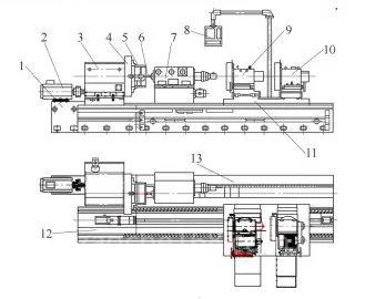 1—電動(dòng)機(jī)底座 2—主電動(dòng)機(jī) 3—床頭箱 4—卡盤 5—工件 6—芯軸 7—尾座 8—操作按鈕站 9—精磨磨削刀架 10—粗磨磨削刀架 11—拖板 12—輔助床身 13—床身