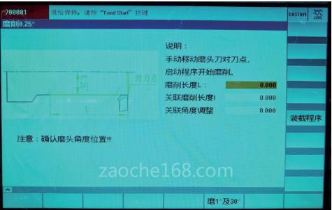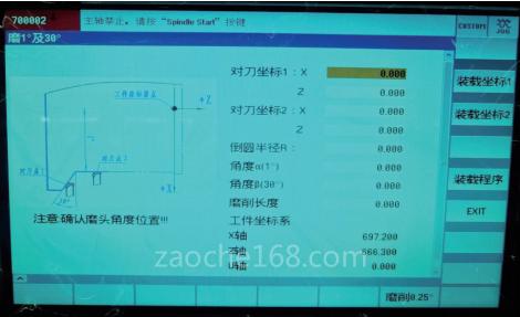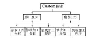 磨削用戶界面一共需要兩個(gè):磨1°及30°、磨削0.25°,界面之間通過軟鍵觸發(fā)。根據(jù)界面的圖片指示,操作者手動(dòng)對刀,并通過軟件“裝載坐標(biāo)”將當(dāng)前工件坐標(biāo)載入到輸入框內(nèi),并輸入相關(guān)加工參數(shù),按下“裝載程序”,系統(tǒng)將自動(dòng)調(diào)用加工程序,操作者直接啟動(dòng)加工,用戶界面結(jié)構(gòu)如圖3所示。用戶界面的內(nèi)容和具體功能通過編輯custom.com文件來實(shí)現(xiàn)。