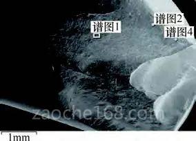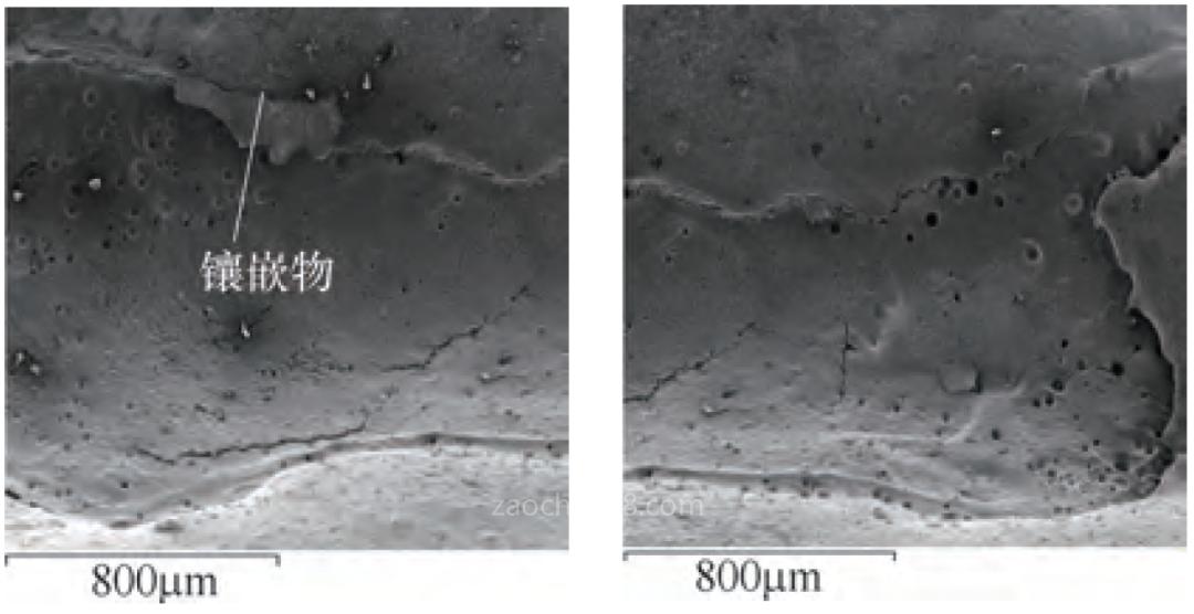 對(duì)鑲嵌異物及缺陷周邊進(jìn)行SEM掃描電子顯微鏡分析,缺陷底部整體形貌如圖8a所示,缺陷底部存在大量微裂紋,由淺往深延展至底部翹皮部位,如圖8b和圖8c所示。