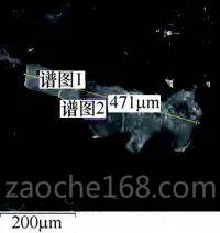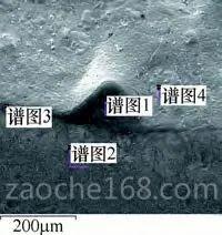 綜上所述,減速機(jī)軸齒缺陷表面和內(nèi)部均殘余少量異物嵌入,與樣品基體成分明顯不同,周邊組織為貝氏體,凹坑周邊無(wú)明顯脫碳,內(nèi)側(cè)內(nèi)沿有一層氧化鐵附著,缺陷底部存在大量微裂紋,由淺往深延展至底部翹皮部位。