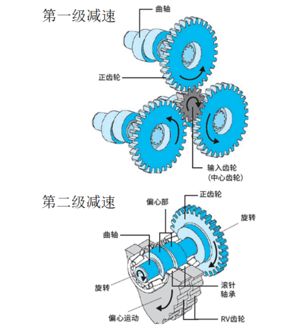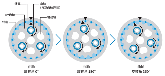 3.在曲軸的偏心部有通過滾針軸承安裝的2個RV齒輪。(安裝2個RV齒輪是為了平衡作用力)