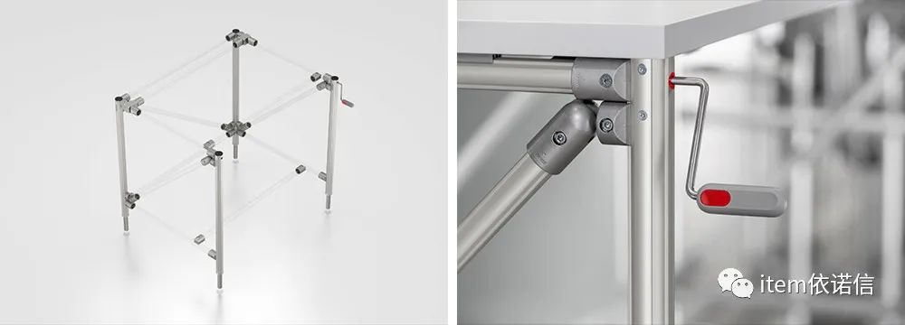 工作臺立柱組件 K 的四根立柱可使用曲柄同時調(diào)整 300 毫米。對于移動式工作臺和堅(jiān)固型工作站來說,靈活的純機(jī)械高度調(diào)節(jié)系統(tǒng)和最大限度減少使用材料是非常理想的選擇。在此基礎(chǔ)上,用戶可創(chuàng)建定制尺寸不超過 1800 毫米 x 1800 毫米、承載能力最高 120 千克的解決方案。這款產(chǎn)品有兩種型號可供選擇。
