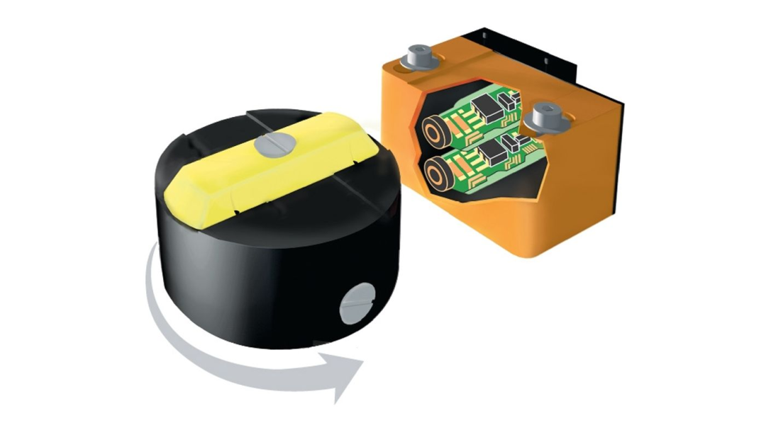 ifm的IN系列傳感器使用標(biāo)準(zhǔn)電感技術(shù)實現(xiàn)金屬目標(biāo)的非接觸式檢測。典型的電感式傳感器包含一個鐵氧體磁芯,周圍環(huán)繞著一圈線圈以形成電感電路。IN傳感器包含兩個鐵氧體線圈。這些線圈垂直放置在外殼內(nèi)。安裝在執(zhí)行器桿上的旋轉(zhuǎn)凸輪包含兩個不銹鋼目標(biāo)物,位于圓盤側(cè)面,相隔 90°,高度不同。