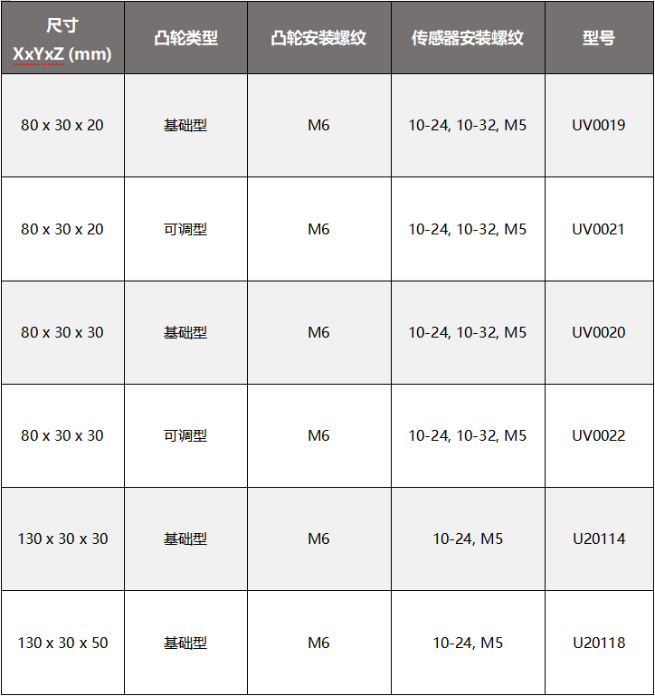 ifm 制造兩種不同類型的凸輪?;就馆嗊m用于標(biāo)準(zhǔn)的 90 度應(yīng)用??烧{(diào)凸輪適用于具有不同目標(biāo)位置的執(zhí)行器。針對更高的桿的封裝包括一個墊片,用于提高傳感器的高度以匹配凸輪上的目標(biāo)。