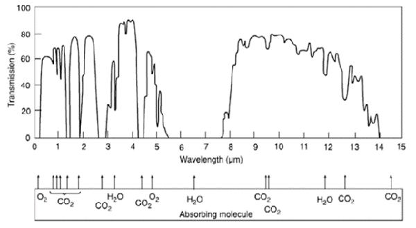 在只考慮大氣分子吸收時(shí),大氣在近紅外(780~1000nm)短波紅外(1.0~2.5μm)、中波紅外(3~5μm)和長波紅外(8~14 μm)有4個(gè)大氣紅外“透射窗口”。