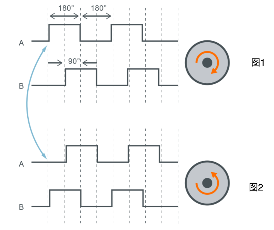 常見的增量型編碼器通常有3個輸出通道:通道A,B,Z。通道A,B相互偏移90°,可用于監(jiān)測軸的旋轉(zhuǎn)方向。如果通道A先于通道B(下圖1),則軸在順時針旋轉(zhuǎn),增量在向上計數(shù)。如果通道B先于通道A(下圖2),則軸在逆時針旋轉(zhuǎn),增量在向下計數(shù)。