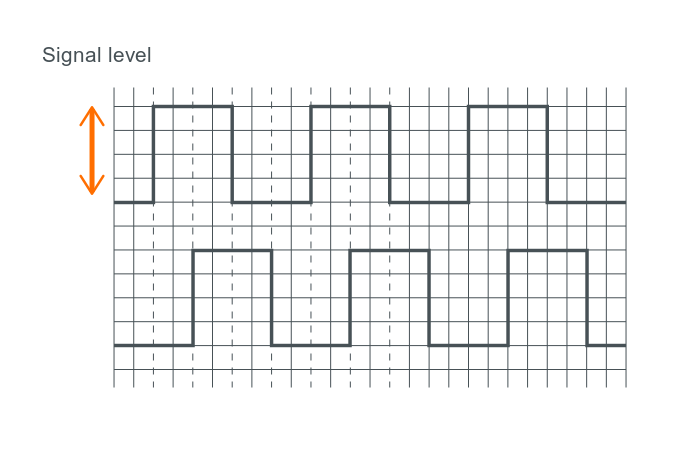 HTL - 輸出信號電平和極性與電源電壓相同。例如,如果電源電壓是+24 VDC,輸出信號就是+24 VDC。
